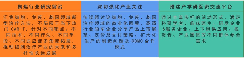本屆大會誠邀國內(nèi)外領先學術科研機構、大型醫(yī)院、產(chǎn)業(yè)鏈上下游企業(yè)、國家監(jiān)管機構、產(chǎn)業(yè)園區(qū)、投資機構、行業(yè)協(xié)會等專業(yè)人士共聚上海,分享行業(yè)進展動態(tài),探討產(chǎn)業(yè)發(fā)展瓶頸及細胞治療和基因治療的未來之路!